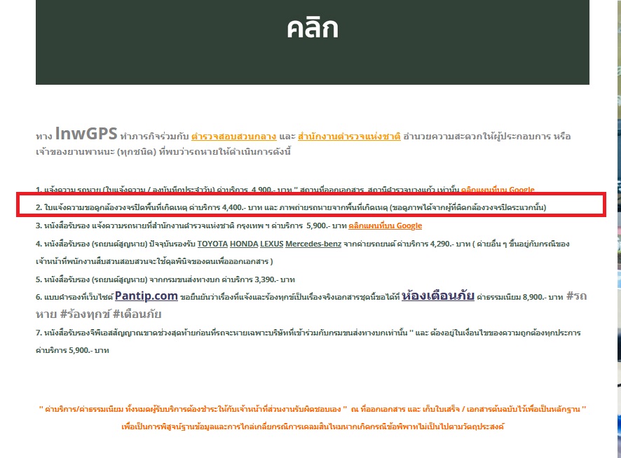 7. หนังสือรับรองจีพีเอสสัญญาณขาดช่วงสุดท้ายก่อนที่รถจะหายเฉพาะบริษัทที่เข้าร่วมกับกรมขนส่งทางบกเท่านั้น '' และ ต้องอยู่ในเงื่อนไขของความถูกต้องทุกประการ ค่าบริการ 5,900.- บาท