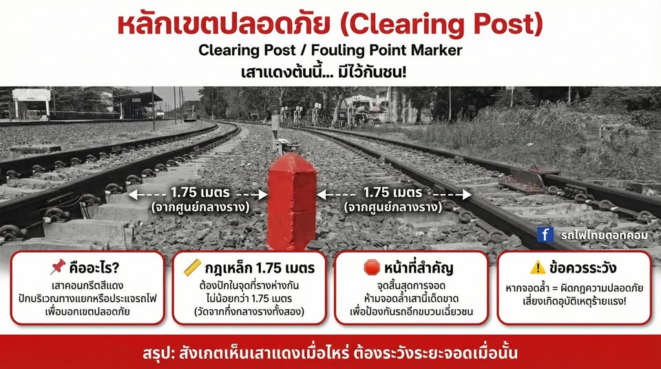 เวลาเรามองไปที่รางรถไฟตรงช่วงทางแยกหรือทางหลีก จะมี "เสาคอนกรีตสีแดง" ต้นเล็กๆ ปักอยู่ระหว่างราง ... เจ้าเสาต้นนี้ไม่ใช่แค่เครื่องหมายธรรมดา แต่มันคือ "หลักเขตปลอดภัย" (Clearing Post หรือ Fouling Point Marker) ที่ทำหน้าที่เหมือน "เส้นตาย" เพื่อความปลอดภัยของขบวนรถ